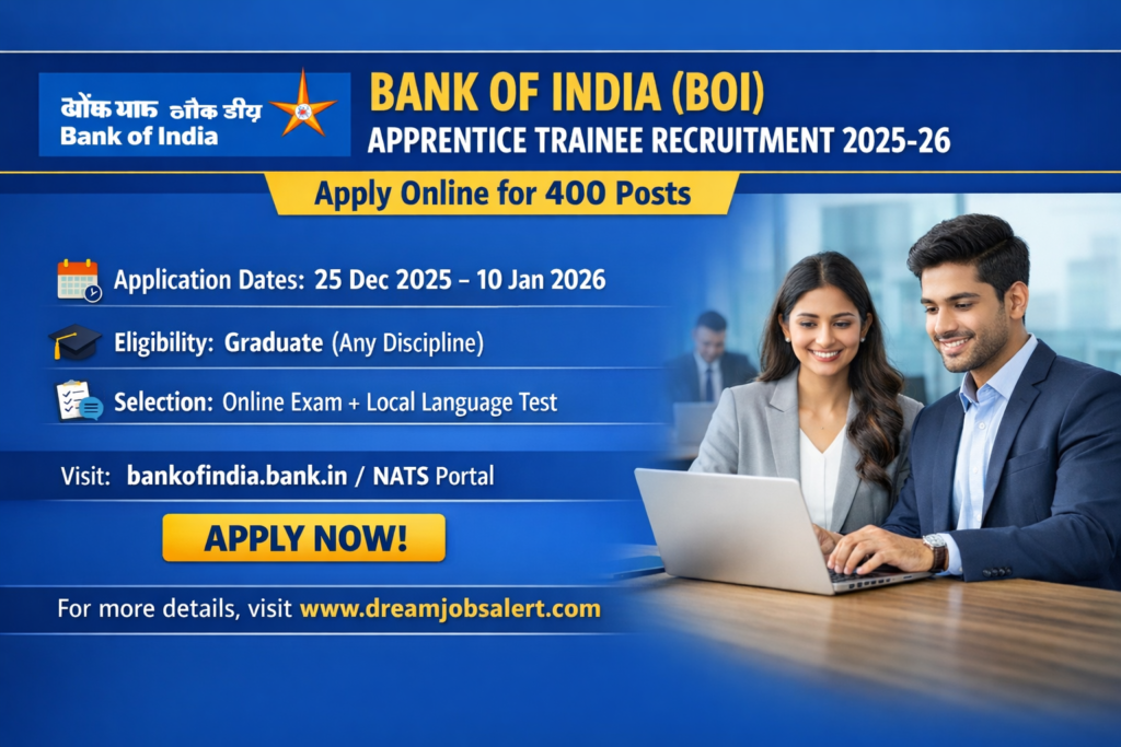 The Bank of India (BOI) Recruitment 2025 has recruiting for 400 positions of Apprentice trainee posts. Applicants who have passed Graduation in any discipline are eligible to apply online. The application process starts on 25-12-2025, and will close on 10-01-2026. All the Interested candidates must submit their applications via the The Bank of India (BOI) Recruitment 2026 official website, www.bankofindia.bank.in