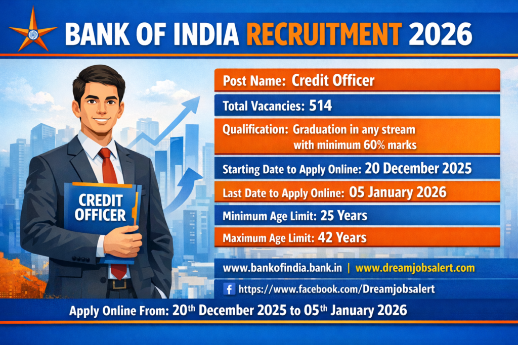 Bank of India Recruitment 2026 has recruiting for 514 positions of Credit Officer posts. Applicants who have passed Graduation in any stream or its equivalent with minimum 60% marks in aggregate from recognized university are eligible to apply online. The application process starts on December 20, 2025, and will close on January 05, 2026. All the Interested candidates must submit their applications via the Bank of India Recruitment 2026 official website, www.bankofindia.bank.in