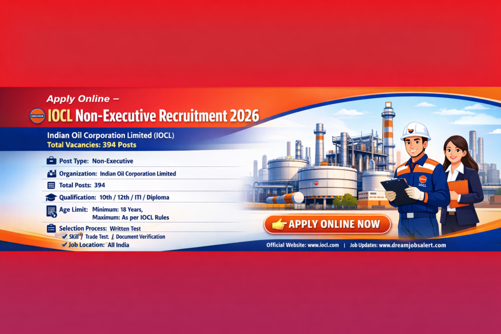 The Indian Oil Corporation (IOCL) has published an official notification for the recruitment of 394 posts of Non Executive. All the Eligible and interested candidates can apply online through The Indian Oil Corporation (IOCL) official website. The last date to submit the application form is 09-01-2026.