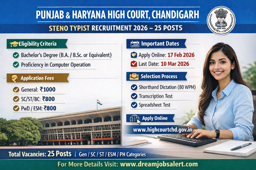 The Punjab and Haryana High Court Chandigarh Steno Typist Recruitment 2026 has recruiting for 25 positions of Steno Typist Posts. Applicants who have passed Bachelor’s degree (B.A. / B.Sc. or equivalent) from a recognized university, Proficiency in computer operation (Word Processing + Spread Sheets) are eligible to apply online. The application process starts on 17-02-2026, and will close on 10-03-2026. All the Interested candidates must submit their applications via the The Punjab and Haryana High Court Chandigarh Recruitment 2026 official website, www.highcourtchd.gov.in.