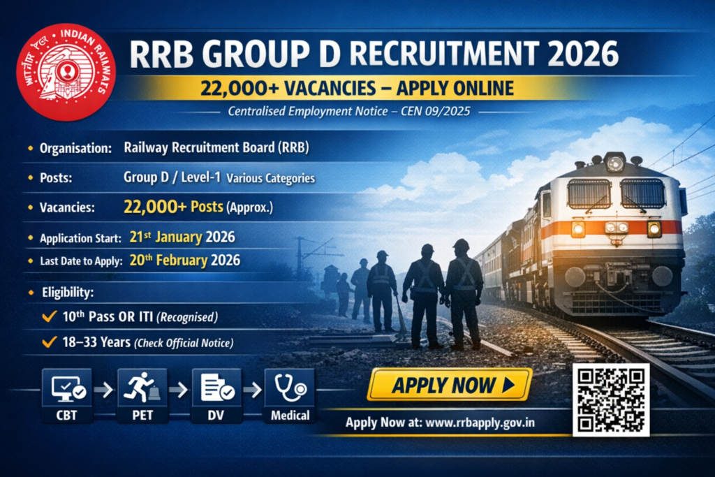 The Railway Recruitment Board (RRB) has published an official notification for the recruitment of 22000 posts of Group D. All the Eligible and interested candidates can apply online through The Railway Recruitment Board (RRB) official website. The last date to submit the application form is 22-02-2026.