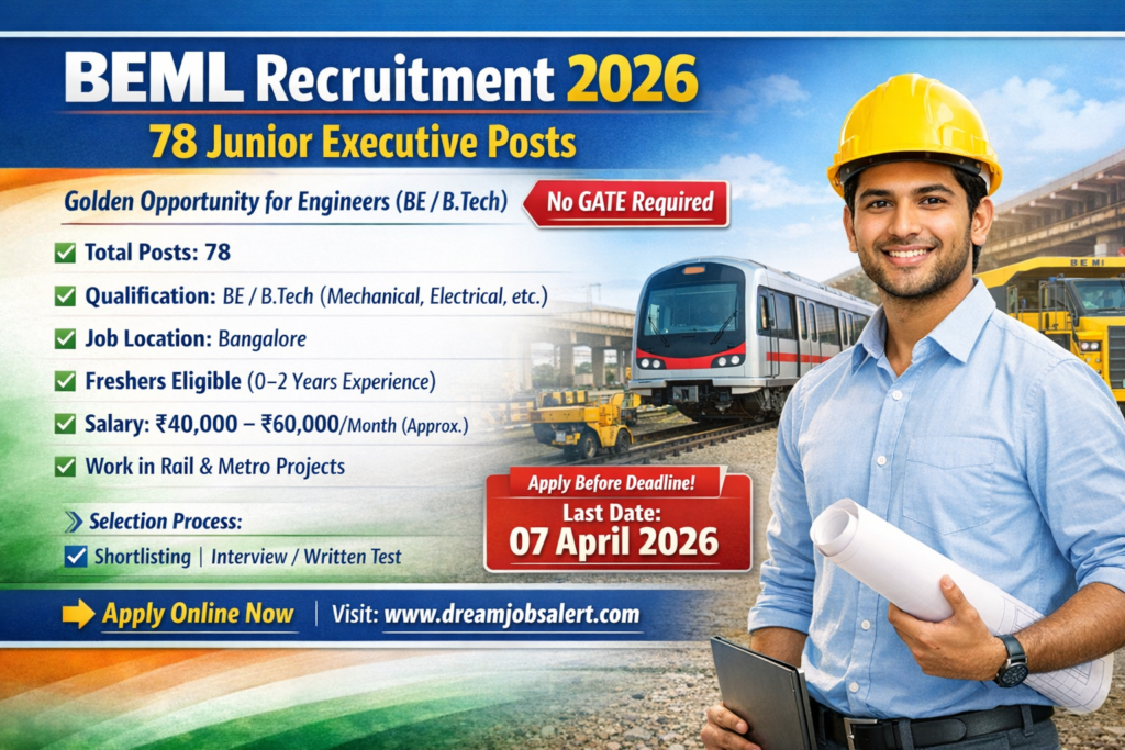 The Bharat Earth Movers (BEML) notification pdf for positions like 78 Junior Executive Posts were released on 25-03-2026, on the official website www.bemlindia.in. You can find all the important details about the job openings, Apply Online, BEML Selection process, including the number of vacancies, age requirements, application fees, selection process, and how to apply online, in dream jobs alert portal. Be sure to check the latest updates on Sarkari Results for both central and state government jobs and top banking jobs in India 2026 apply online. You can also download BEML Junior Executive Recruitment 2026 Syllabus pdf and detailed job notification pdf from dream jobs alert website.